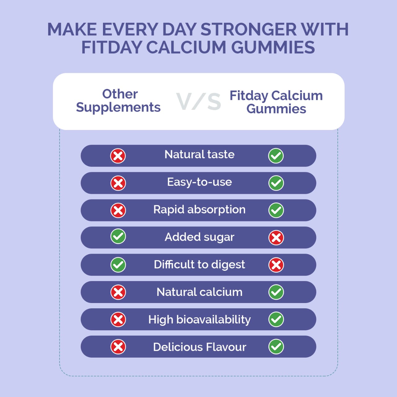 Strong bones start early. Fitday Kids Calcium Gummies are enriched with Calcium, Vitamin D3, and Zinc to support healthy bone and teeth development. These strawberry-flavoured gummies make daily calcium intake fun, easy, and absolutely delicious, with no chalky taste, no fuss, just pure nutrition in every bite.
