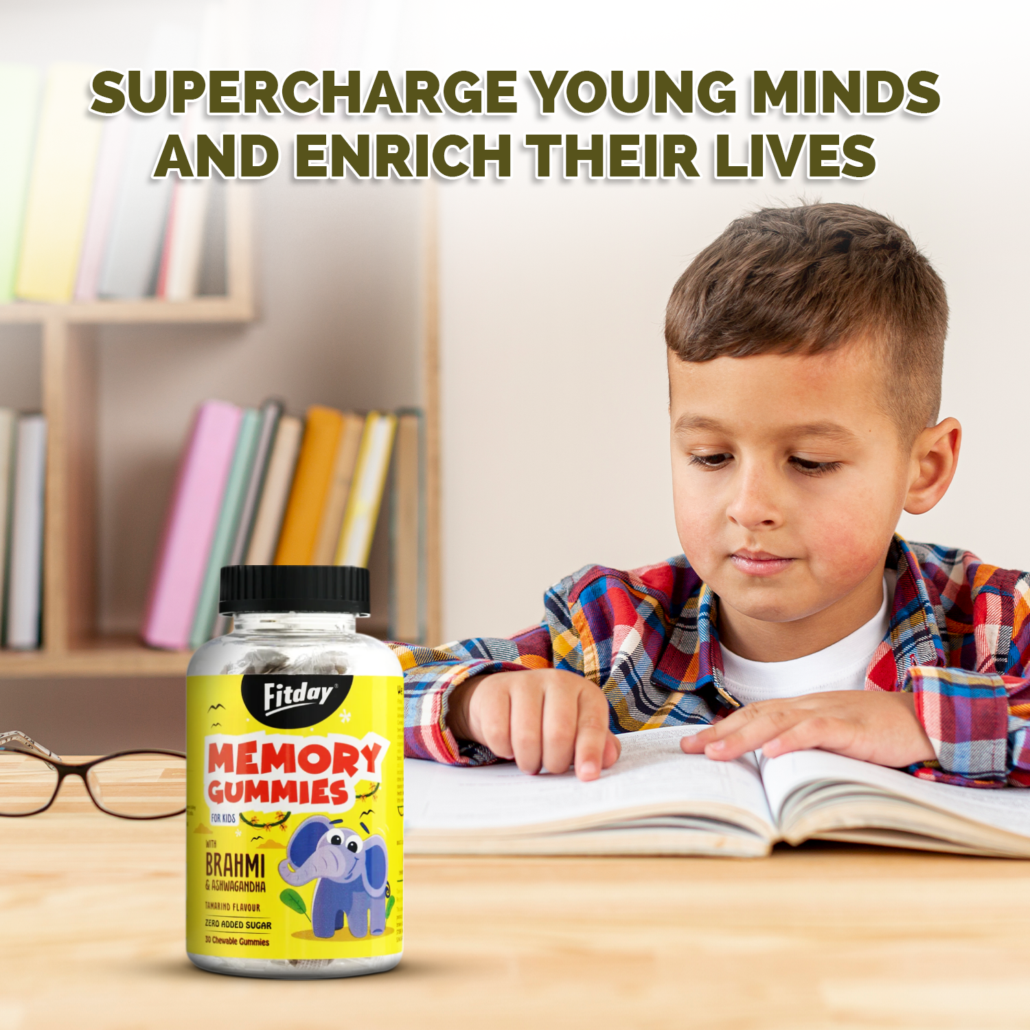 The key ingredients in Fitday Memory Gummies include Brahmi, Ashwagandha, and Piyusha. Brahmi is beneficial for effective brain functioning and improving attention span. Ashwagandha helps reduce stress and anxiety while also enhancing cognitive function. Piyusha is known to improve memory and cognitive function.