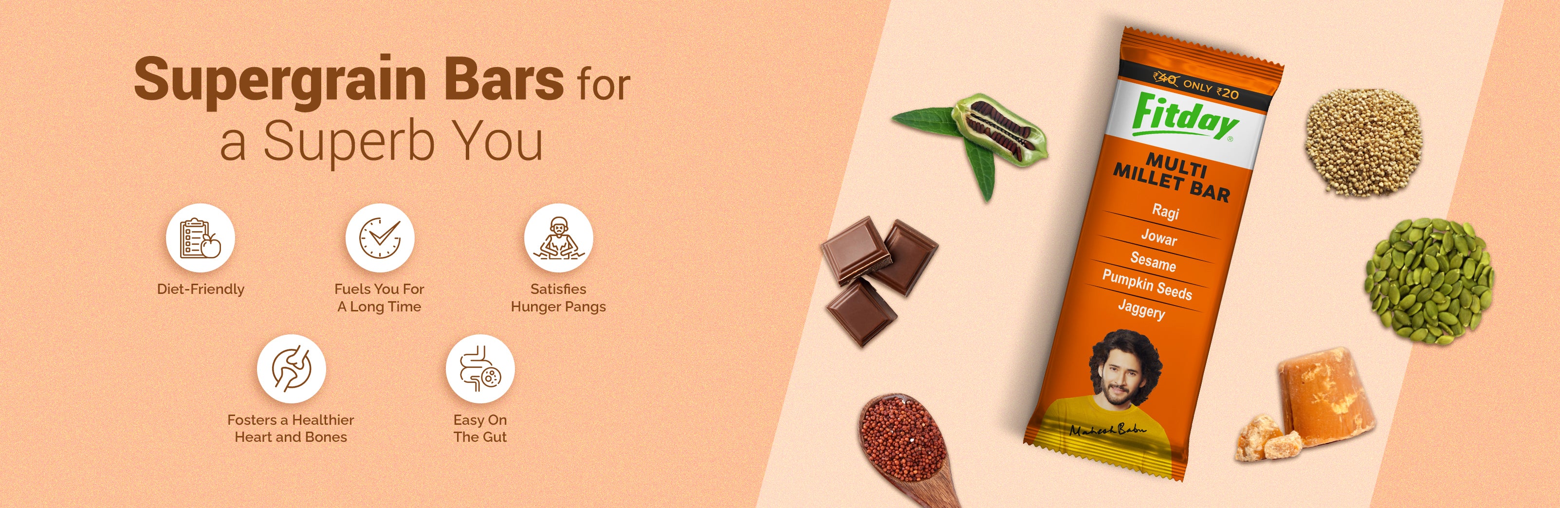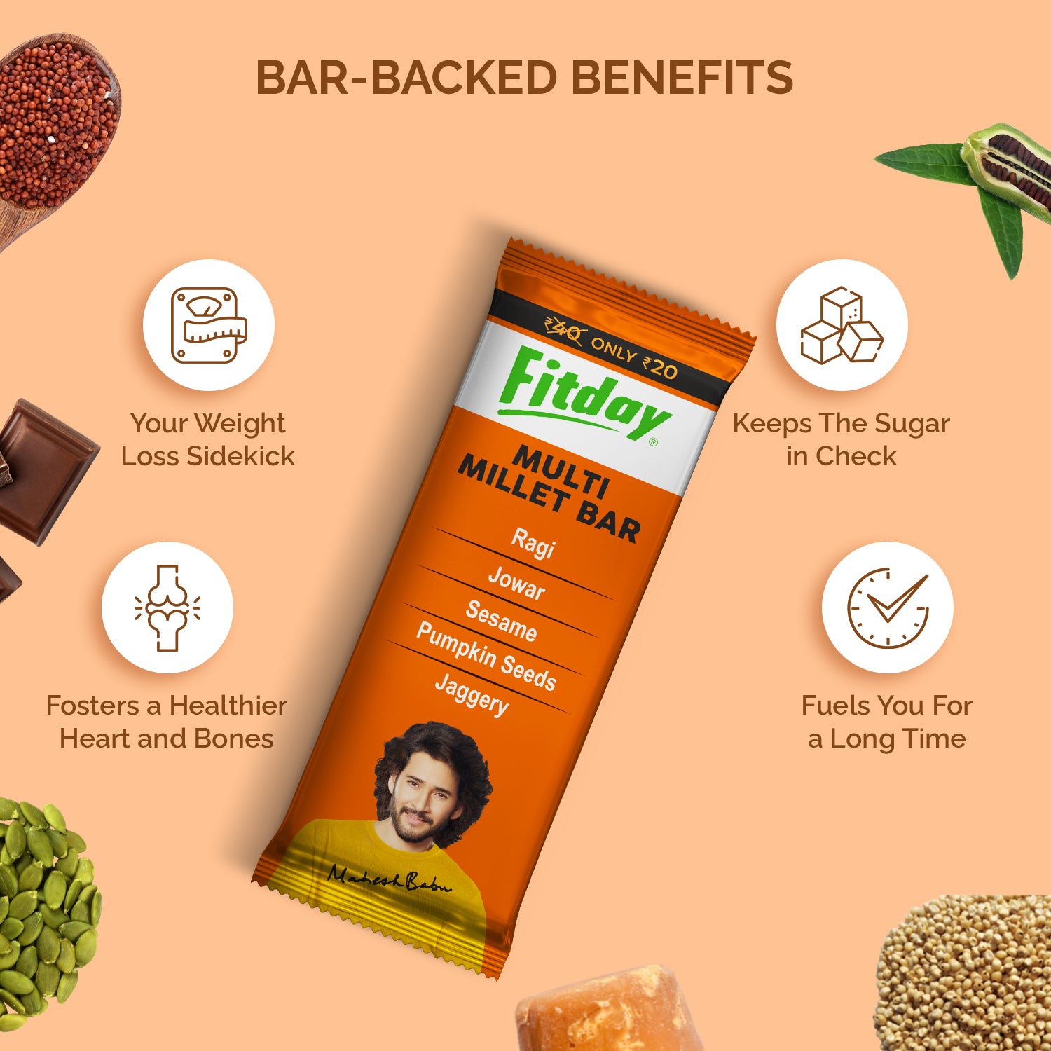Millets are highly beneficial for weight loss. Our healthy chocolate protein bars for weight loss are rich in fibre and essential nutrients, promoting a sense of fullness, and curbing excessive calorie intake.