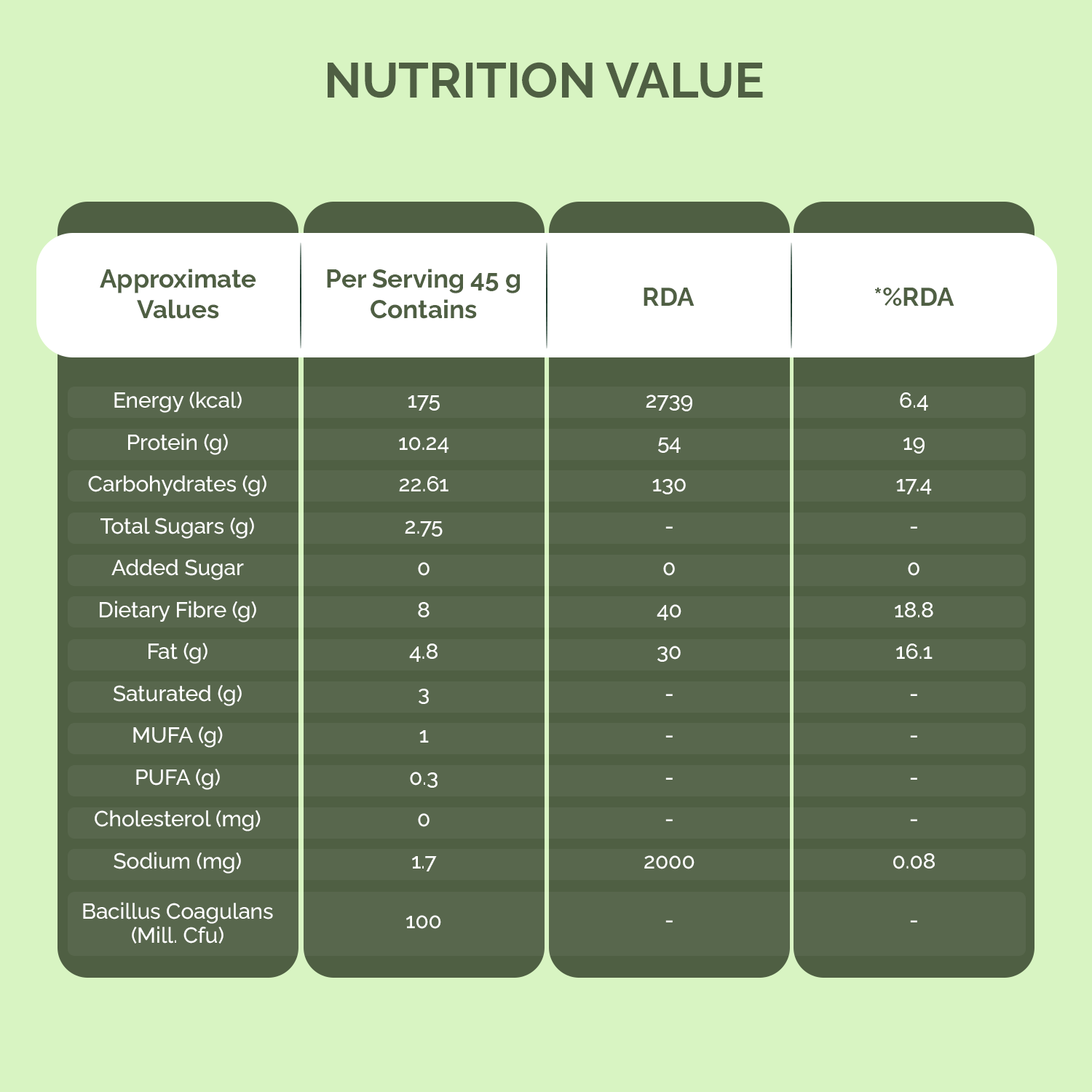 Our healthy Plant Protein Bar contains 10 g of protein, 8 g of dietary fibre, and 100 million CFUs of probiotics.