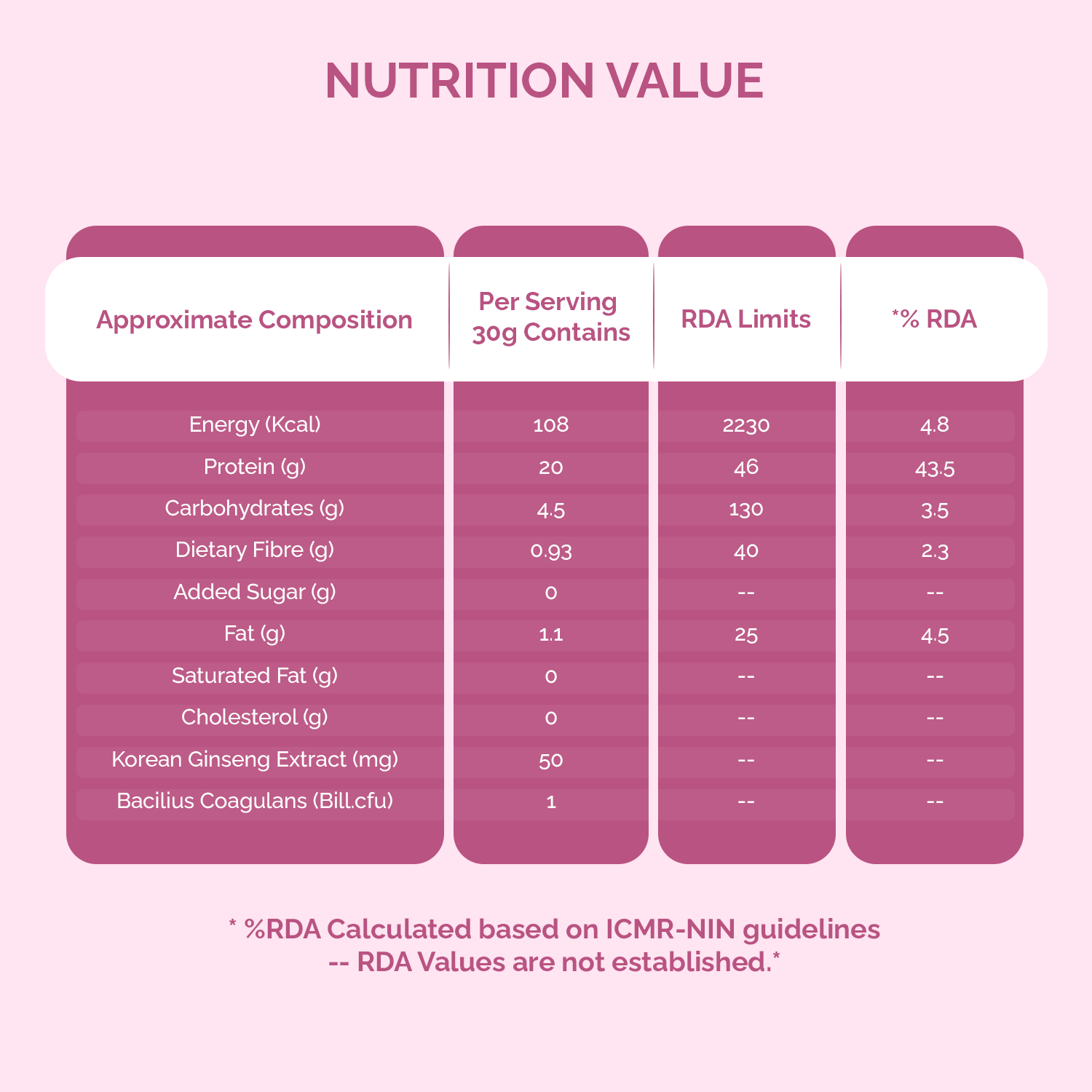 The recommended dietary allowance suggests consuming 20 grams of protein for an adult. With Fitday Plant-Based Protein Powder for Her, one scoop per day should be sufficient.