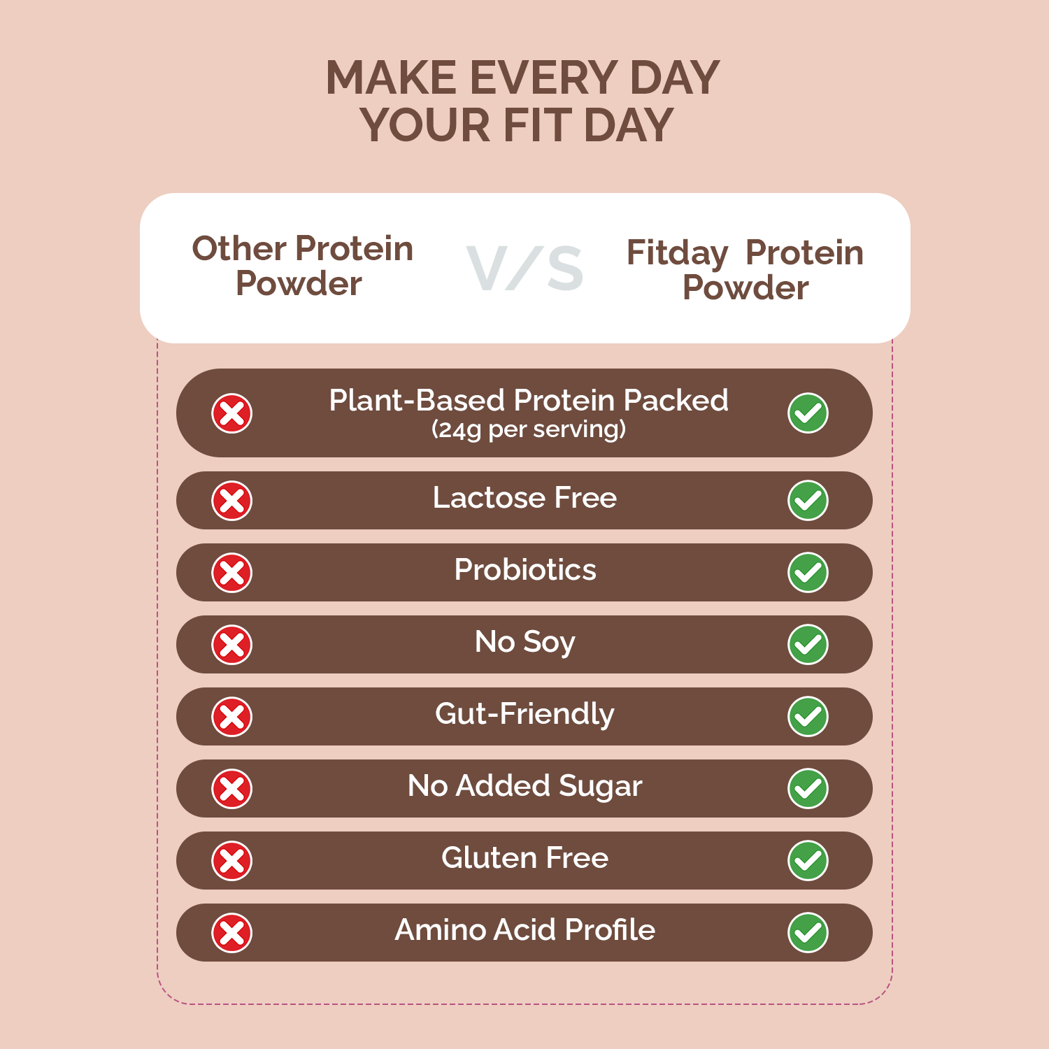 Fitday brings the decadence of chocolate in every wholesome sip for those who live life on the go. Whether you're hitting the gym, hiking a trail, or gearing up for a flavorful adventure, Fitday's got your back with the ultimate blend of plant-based goodness. Supercharge your life by shaking it, blending it, or even baking it into your favorite treats, one delicious scoop at a time.