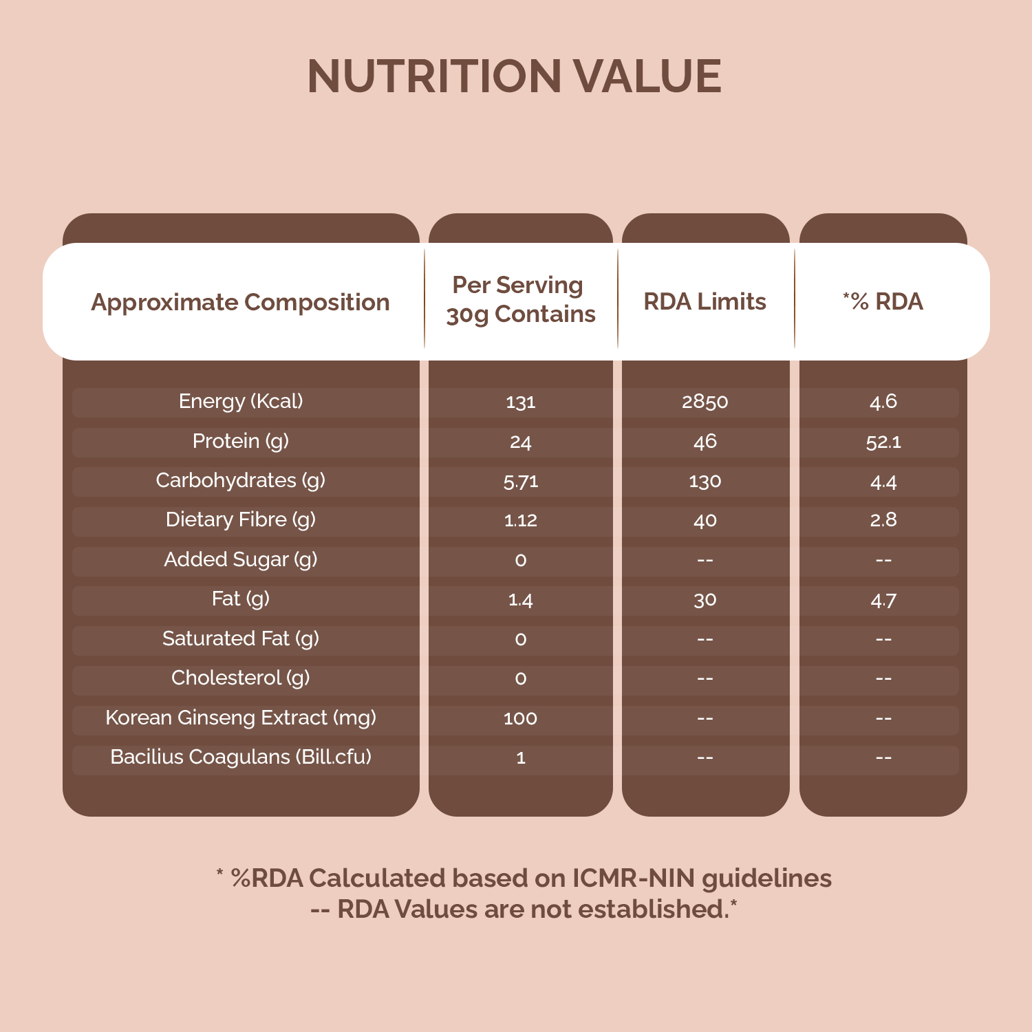 The recommended dietary allowance suggests 24 grams of protein for an adult. With Fitday Plant-Based Chocolate Protein Powder, one scoop per day should be sufficient.